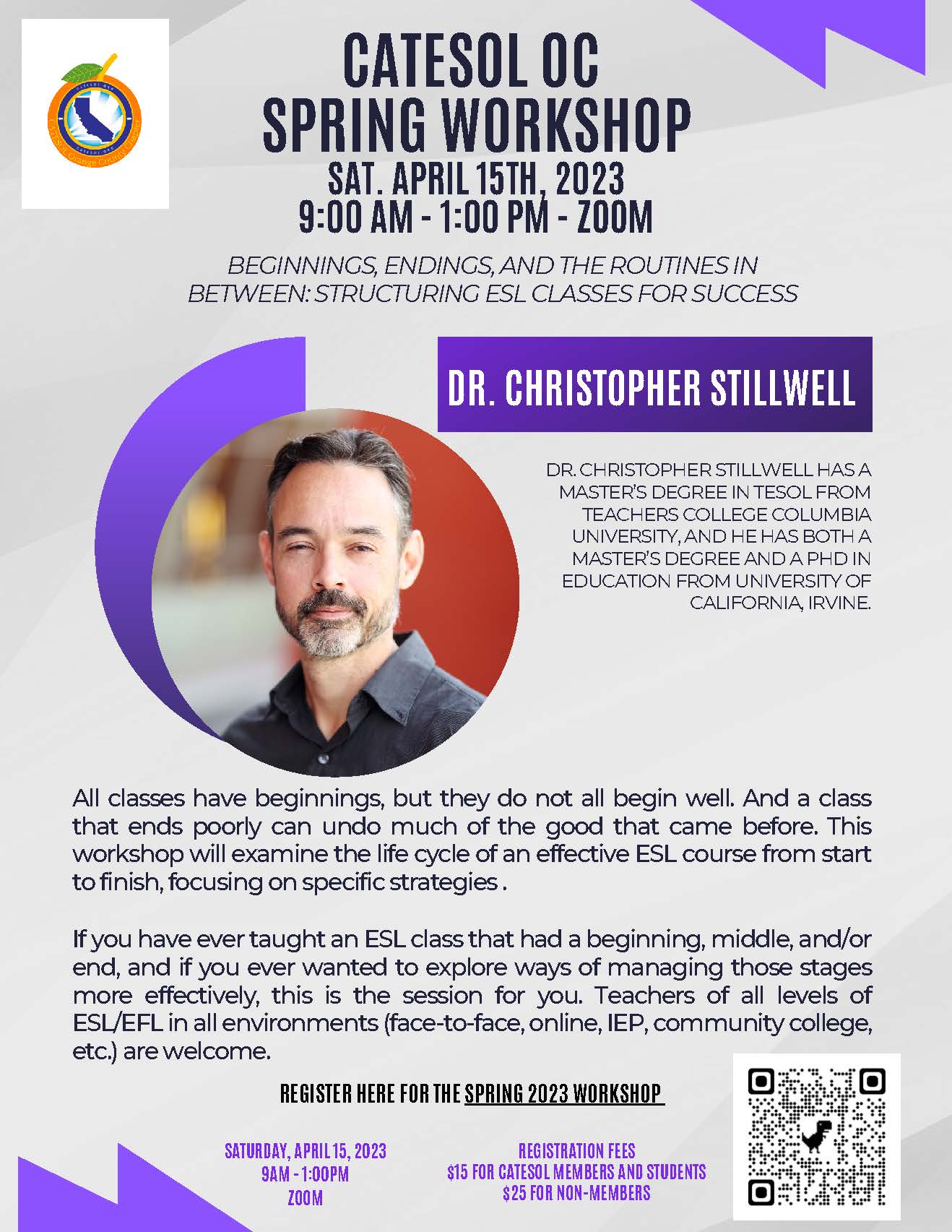 *We encourage graduate students to apply for the Carol Bander Graduate Student Initiative (GSI) to get a free workshop admission and a one-year CATESOL student membership. Use this application form.
